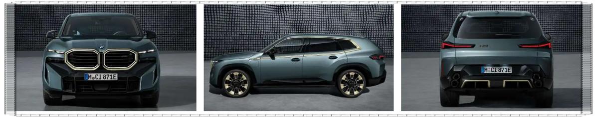 측면 디자인은 쿠페스타일과 균형잡힌 비율, 가장 어두운 창문 색상으로 BMW XM의 강력한 디자인 모습을 강조하며, 23인치 경합금 나이트 골드 휠로 더욱 독창적인 디자인을 완성했습니다. 후면은 수직으로 배치된 육각형 M투윈테일 파이프 및 골드 색상의 디퓨져 그리고 XM 로고가 독특한 분위기를 창조해 냅니다. 양쪽에 배치된 M로고는 M1모델처럼 M 전용 모델임을 확실하게 부각하고 있습니다.