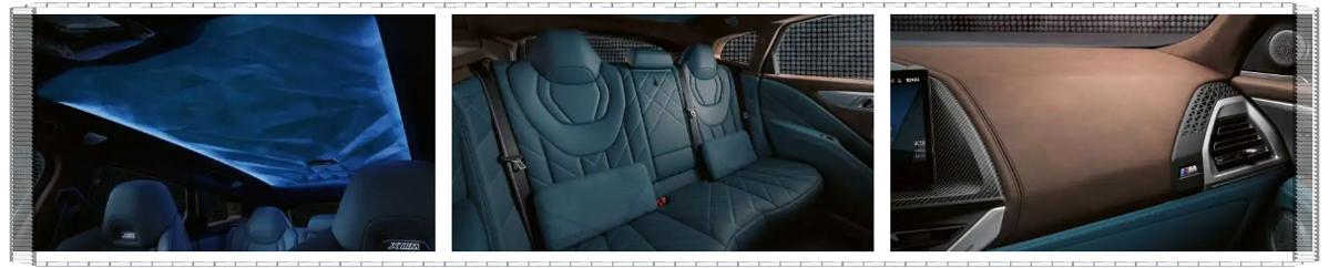 일루미네이티드 헤드라이너는 삼차원의 프리즘 구조 형태로 다이아몬드 모양의 헤드레스트 및 스티칭 패턴 그리고 어두운 창문 색상으로 더욱 미래지향적인 느낌을 강조했으며 다양한 조명과 색상 및 구성을 제공하여 개인 설정 및 주행 모드와 분위기에 따라 변경도 가능합니다. M라운지는 넓은 공간과 일체형 뒷좌석 그리고 편안한 쿠션 등의 디테일로 불편함 없는 고급스러움을 동시에 느낄수 있게 제공합니다. 인스트루먼트 패널 및 도어 트림에 부착된 빈티지한 느낌의 새로운 가죽 소재로 자연스러운 질감으로 매끄럽고 세련된 느낌을 전달합니다. 가죽 소재는 BMW XM에 처음 적용되었으며 특수 가공 및 정교화 과정을 통해 모든 모델에서 시선을 사로잡는 창의적이면서도 개별적인 스타일 연출이 가능합니다.